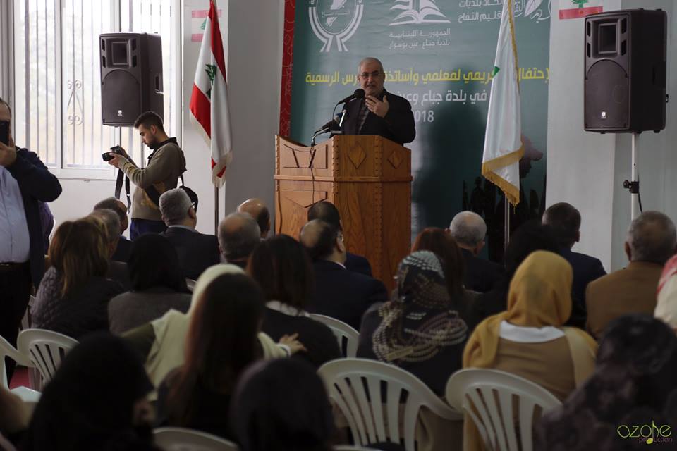 نظم إتحاد بلديات إقليم التفاح وبلدية جباع-عين بوسوار وجمعية البر والإحسان لأبناء جباع، وبرعاية رئيس كتلة الوفاء للمقاومة الحاج محمد رعد، احتفالاً تكريمياً لأساتذة المدارس الرسمية في بلدتي جباع وعين بوسوار وذلك يوم السبت الواقع في 10 آذار 2018، حضره حشد من الفعاليات الرسمية والسياسية والتربوية والإجتماعية. وكانت كلمة لرئيس إتحاد بلديات إقليم التفاح الحاج بلال شحادة أكد فيها على سعي الإتحاد الدائم للاهتمام بالشأن التربوي والمساهمة أيضاً للنهوض بمستوى التعليم الرسمي. كما أكد رئيس كتلة الوفاء للمقاومة الحاج محمد رعد في كلمته على أهمية دعم المدرسة الرسمية لجعل صورتها باهرة وجاذبة مشدداً على أهمية أداء الرسالة التربوية والإنسانية والوطنية في بناء الأجيال. بعدها توالت كلمات لرئيس بلدية جباع-عين بوسوار الحاج أحمد غملوش، ورئيس جمعية البر والإحسان الأستاذ محمد عيسى أكدوا فيها علأهمية واستمرار دعم التعليم الرسمي بكافة الوسائل المتاحة، أما كلمة الأساتذة ألقتها مديرة ثانوية جباع الأستاذة لطفية مهدي