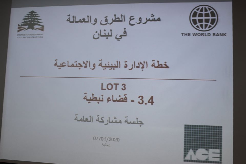 ضمن إطار مشروع تأهيل الطرق المموّل من البنك الدولي، عُقد في إتحاد بلديات إقليم التفاح نهار الثلاثاء الموافق 07 كانون الثاني 2020، لقاءٌ تشاوري مع المكتب الهندسي الإستشاري (ACE) المكلّف من قبل مجلس الإنماء والإعمار للقيام بالدراسة المفصّلة وإعداد ملفات تلزيم لتأهيل طرق محدّدة تقع ضمن نطاق قضاء النبطيّة، ألا وهي: طريق عرب الجل – صربا – حومين الفوقا / طريق زفتا – النميرية – الشرقية / طريق حبوش – عربصاليم / طريق أنصار – أبو الأسود.