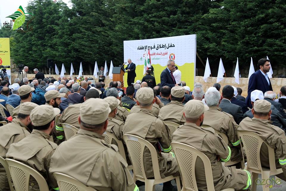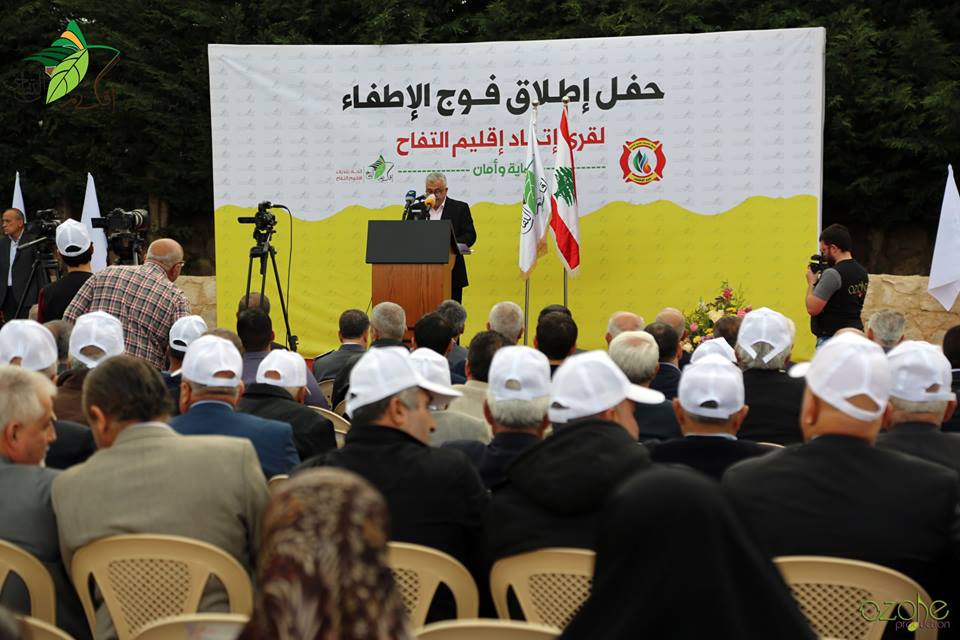 بعد استعراض آليات فوج الاطفاء لقرى الإتحاد بقيادة العناصر المدربين، ألقى رئيس الإتحاد بلال شحادة كلمة أعلن فيها أنه "بسبب شبه الغياب الكامل للدولة وضعنا كعاملين باسم الناس وخدمتهم في موضع التصدي والسعي الحثيث" وذكر أن المشروع "الذي نلتقي اليوم لإعلانه وإطلاقه، شاهد من شواهد التصدي من قبل البلديات وإتحاداتها لواجبات هي أولاً وأخيراً من أبرز واجبات الدولة"، وأضاف مشيراً لحيوية وأهمية المشروع حيث يوفر الآتي: سيارات إطفاء لكل بلدية من بلديات الإتحاد، توفير سيارة إنقاذ لإتحاد بلديات إقليم التفاح وجبل الريحان مجهزة بأحدث وأفضل التجهيزات عالية الجودة، إضافة إلى سيارة دعم ميداني مجهزة بالكامل لمؤازرة أي بلدة، فضلاً عن توفير إثنتي عشرة دراجة نارية مجهزة بمدفع إطفاء للتدخل السريع ومعدة للأماكن الجبلية التي يصعب وصول سيارات الإطفاء إليها، ثم توجه بالشكر إلى كل من ساهم بإنجاز المشروع. ثم ألقى رئيس لائحة الأمل والوفاء(رئيس كتلة الوفاء للمقاومة) الحاج محمد رعد كلمة ثمن فيها الخطوة السباقة باعداد فوج للاطفاء، وتوجه بالثناء باسمه وباسم زملائه في لائحة الامل والوفاء، وخص بالشكر رئيس الإتحاد وكل من ساهم في إنجاح المشروع، وأشار أنه لا بد لوزارة الداخلية وللمديرية العامة للدفاع المدني، أن يضعوا قرى وبلديات اقليم التفاح كمحطة أساسية على خارطة إطفاء الحرائق وتزويد هذه المحطة بما تحتاجه مع تطور الايام .